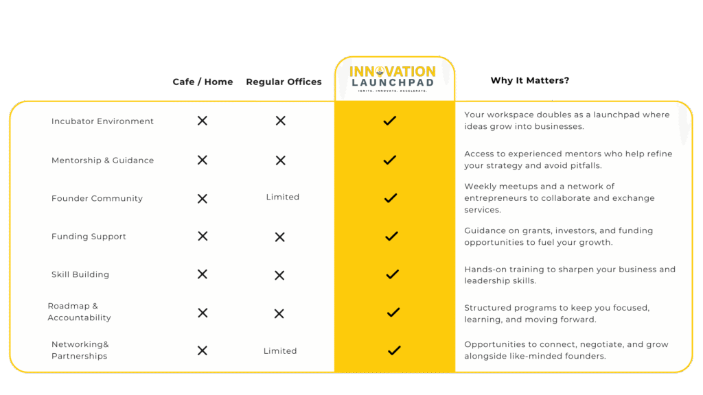 Unlike traditional programs, Innovation Launchpad combines concierge-style business services, global partnerships, inclusive programming, and real investor access—giving you the tools, credibility, and community to thrive.